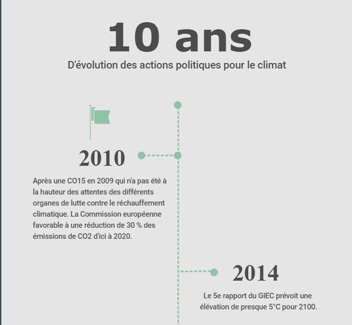 Au début des années 2000, une conscience écologique se forme, des partis politiques se créent… Mais ce n’est qu’à partir des années 2010 que ces formes de lutte contre l’inaction climatique prennent une réelle ampleur au près de la population. En 2010, La Commission européenne s’était donnée 10 ans pour réduire de 30% les gaz à effets de serre produits. Ces objectifs ont depuis été rééditées des dizaines de fois, revus à la baisse puis revalorisées… “ça s’en va et ça revient”. Nous vous proposons de revenir sur cette danse des décisions pour le climat des dix dernières années.